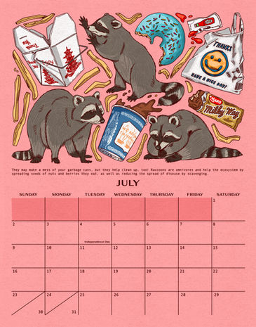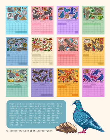 I created and illustrated a 2023 wall calendar that was centered around pests and nuisance animals. Each month features illustrations of one animal accompanied by related objects and fun facts.